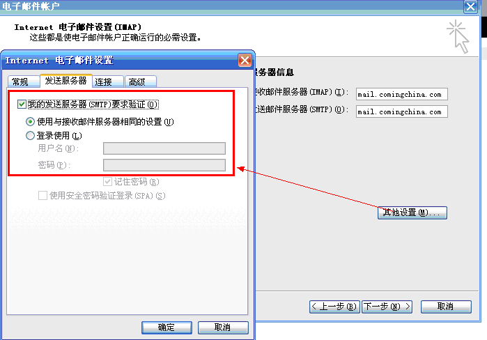 五,選擇”其他設置”在彈出的Internet電子郵件設置中點擊“發(fā)送服務器”標簽,勾選“我的發(fā)送服務器(SMTP)需要驗證,選擇“使用與接收郵件服務器相同的設置”,點擊“確定”