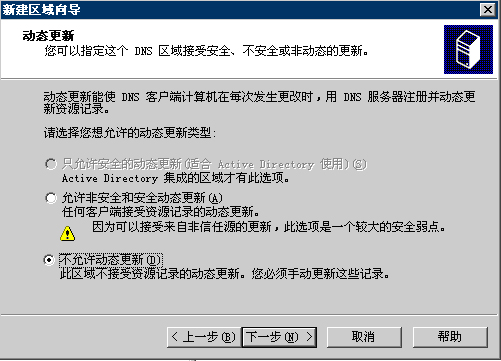 7.動態更新:選擇“不允許動態更新”,如果是在域的環境下一定要選擇允許動態更新。單擊下一步