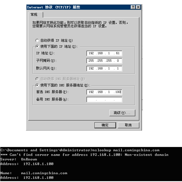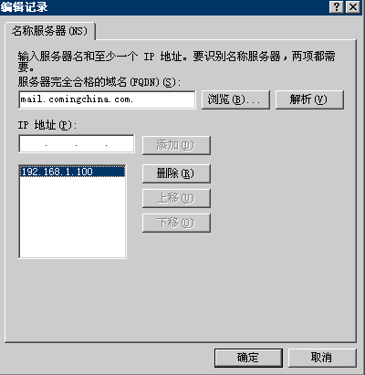 b)在服務器完全合格的域名中寫入:mail.comingchina.com. IP地址為192.168.1.100單擊確定